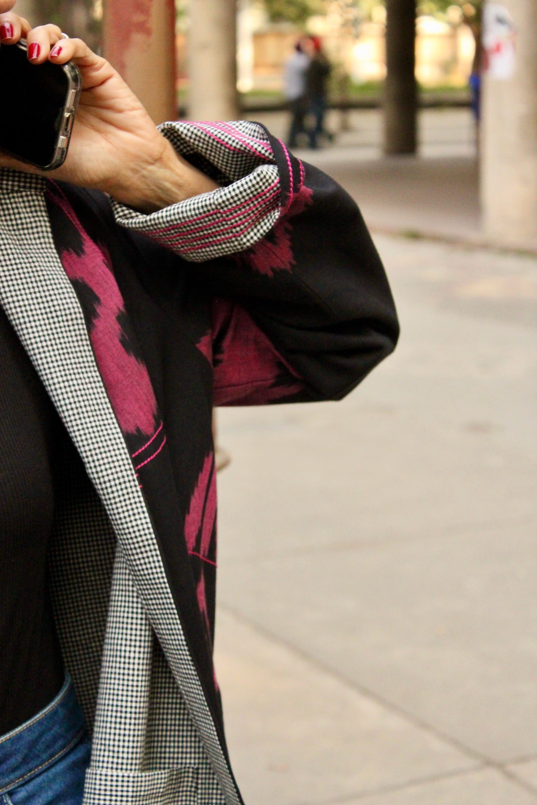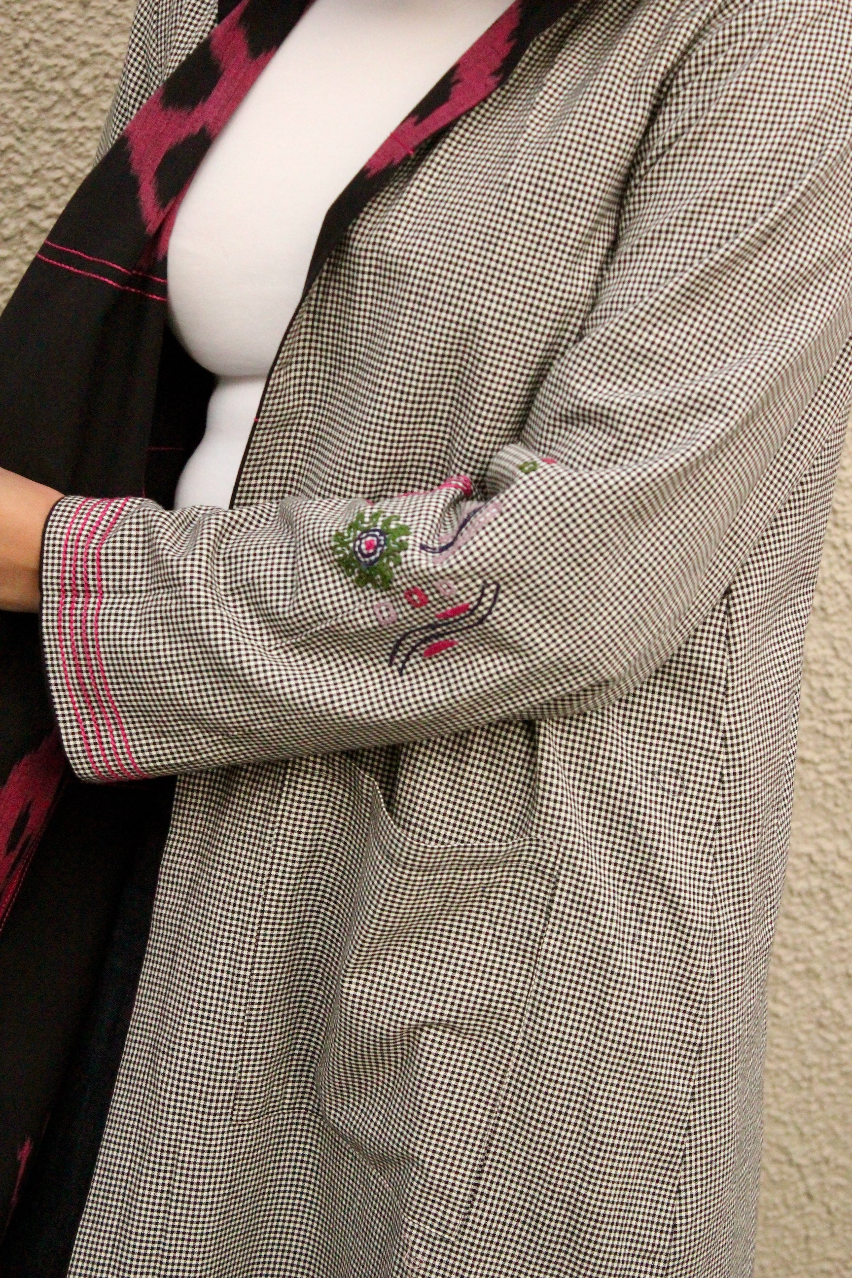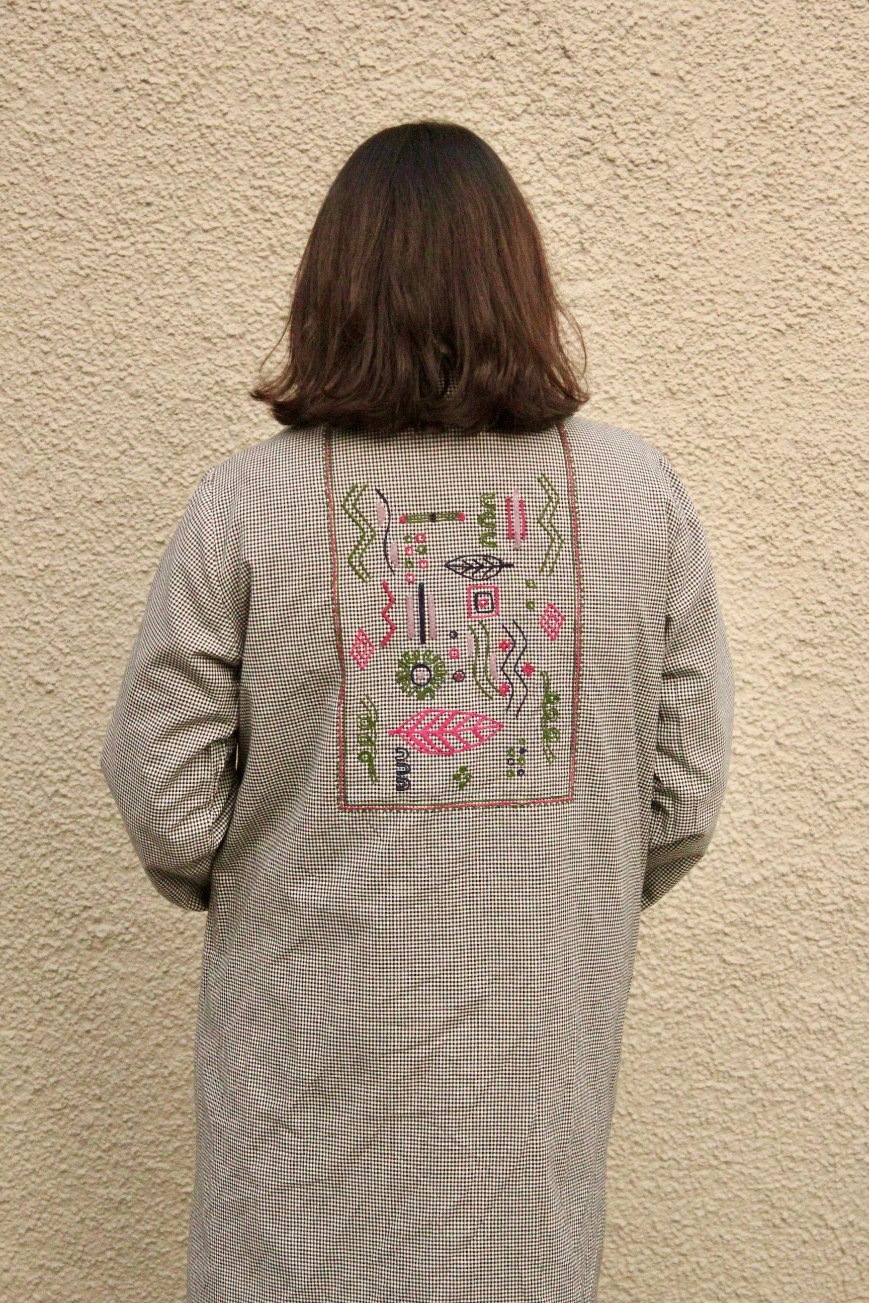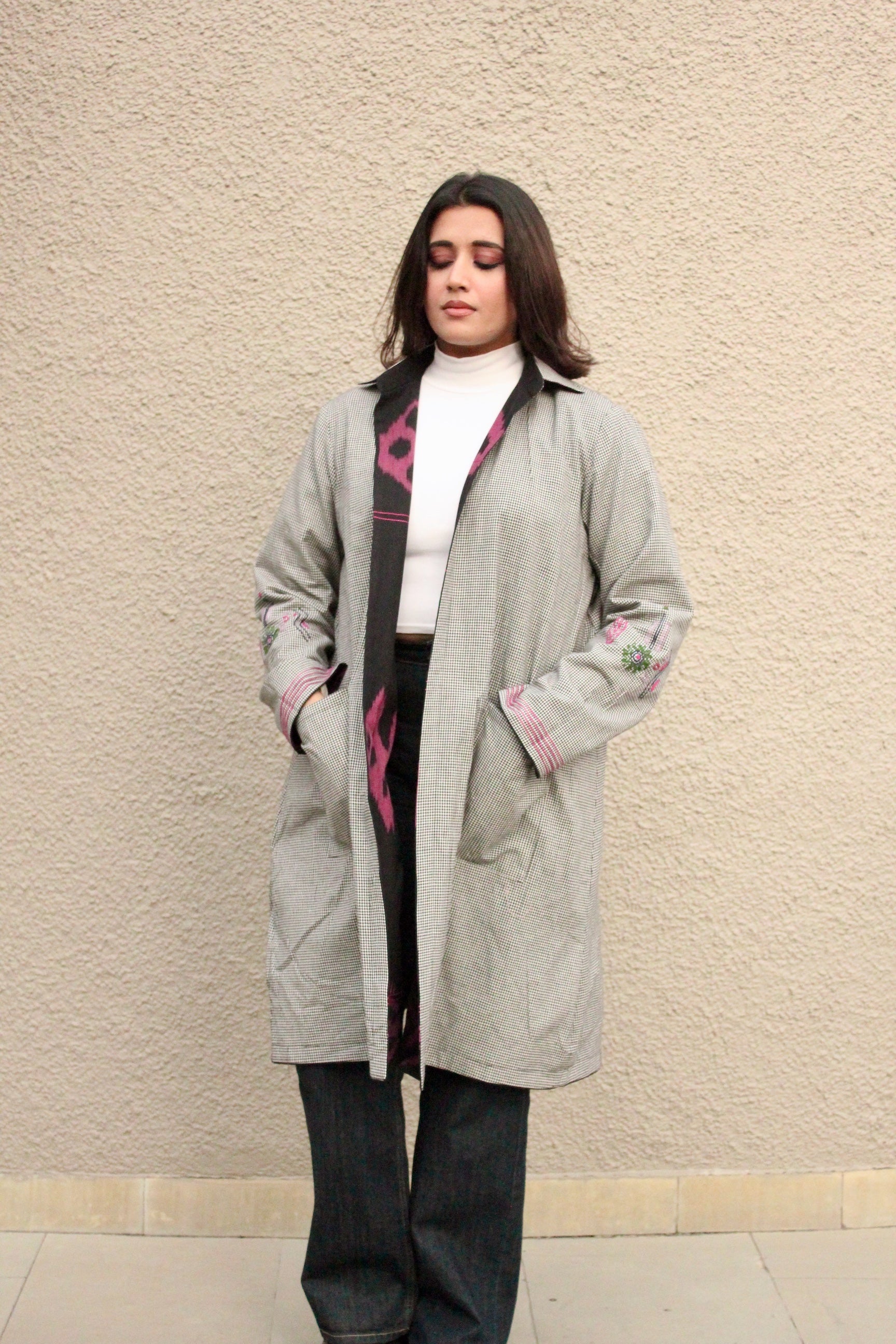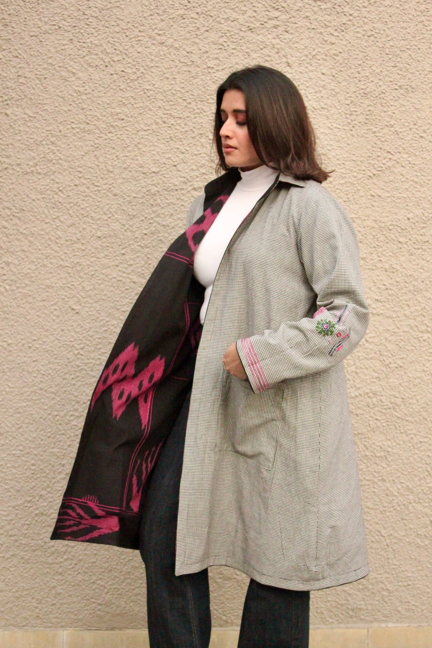 • Reversible black and white gingham check with embroidery with patch pockets.