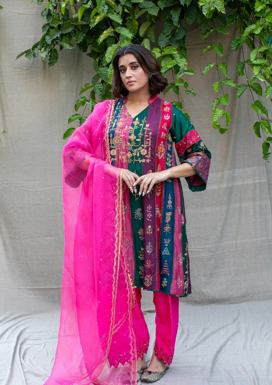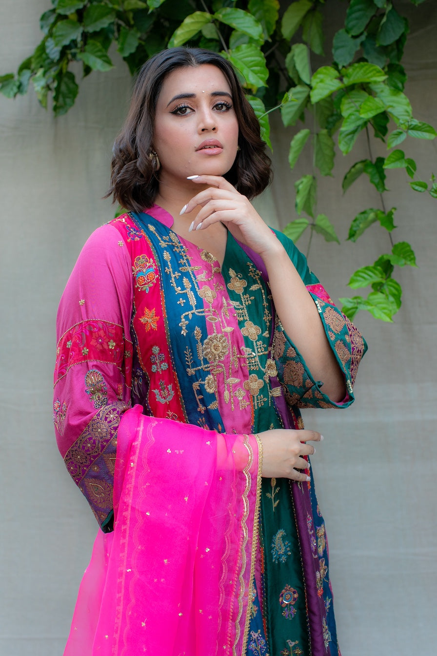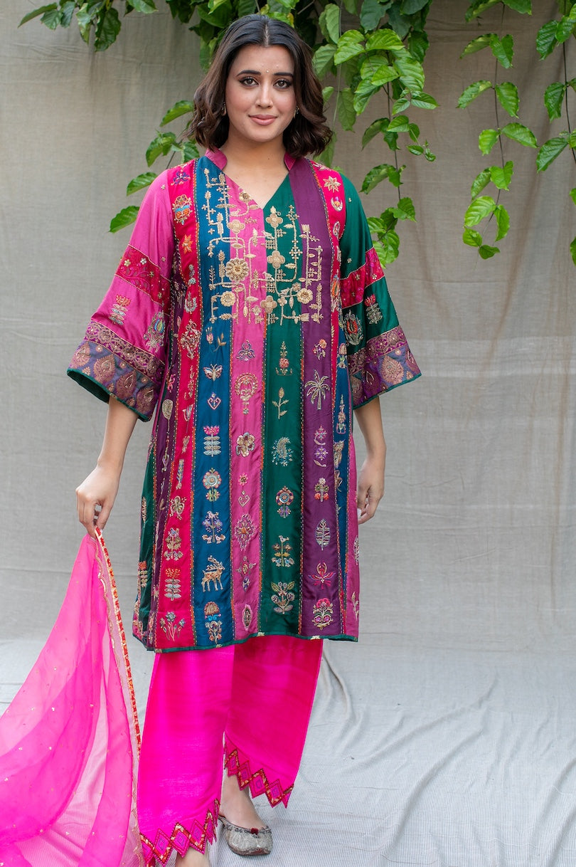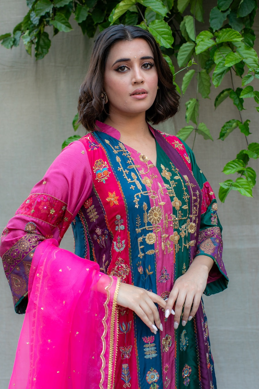 • Multicoloured silk kurta with  very fine detailed embroidery both front and back.