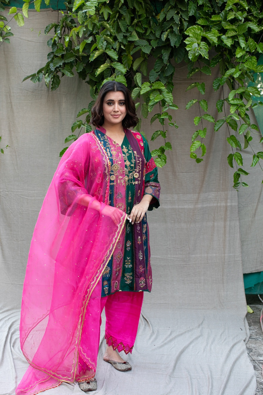 • Pink salwar with embroidery and pure silk organza dupatta with zardozi work