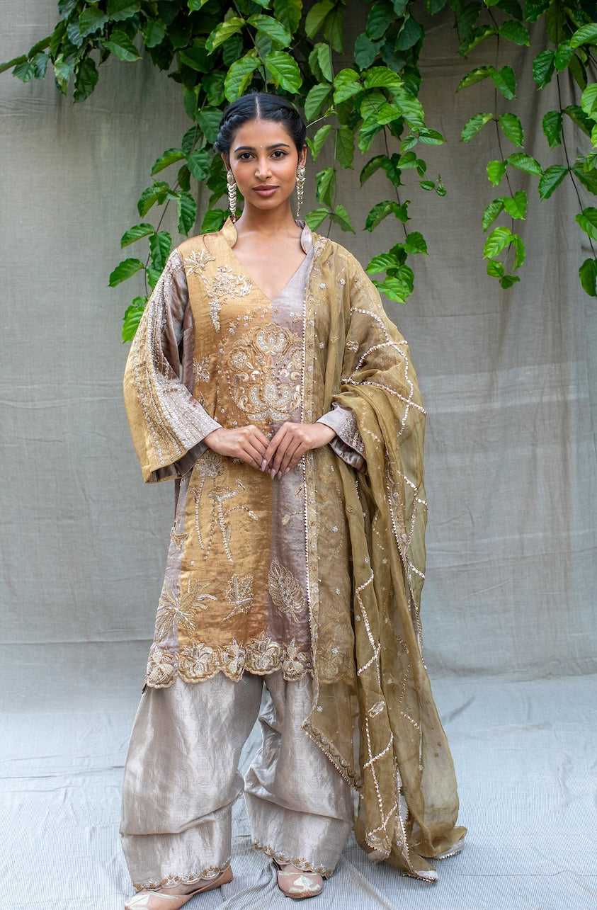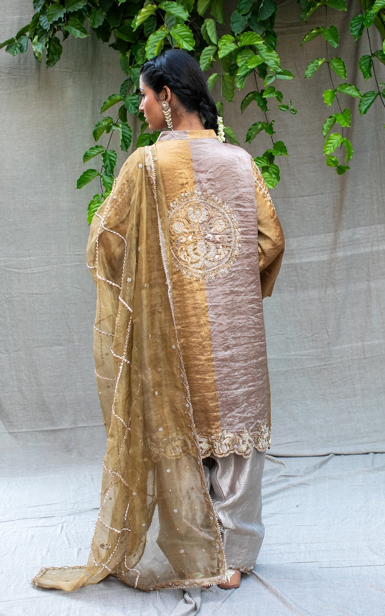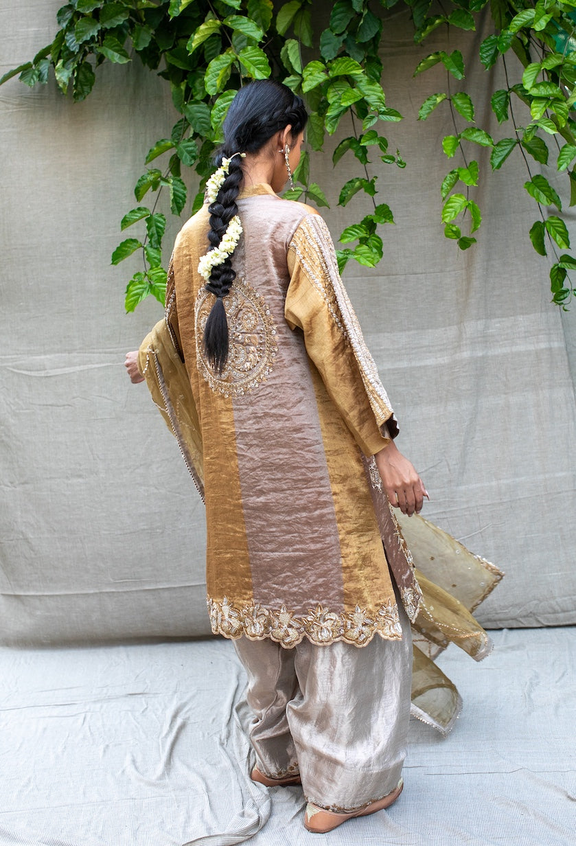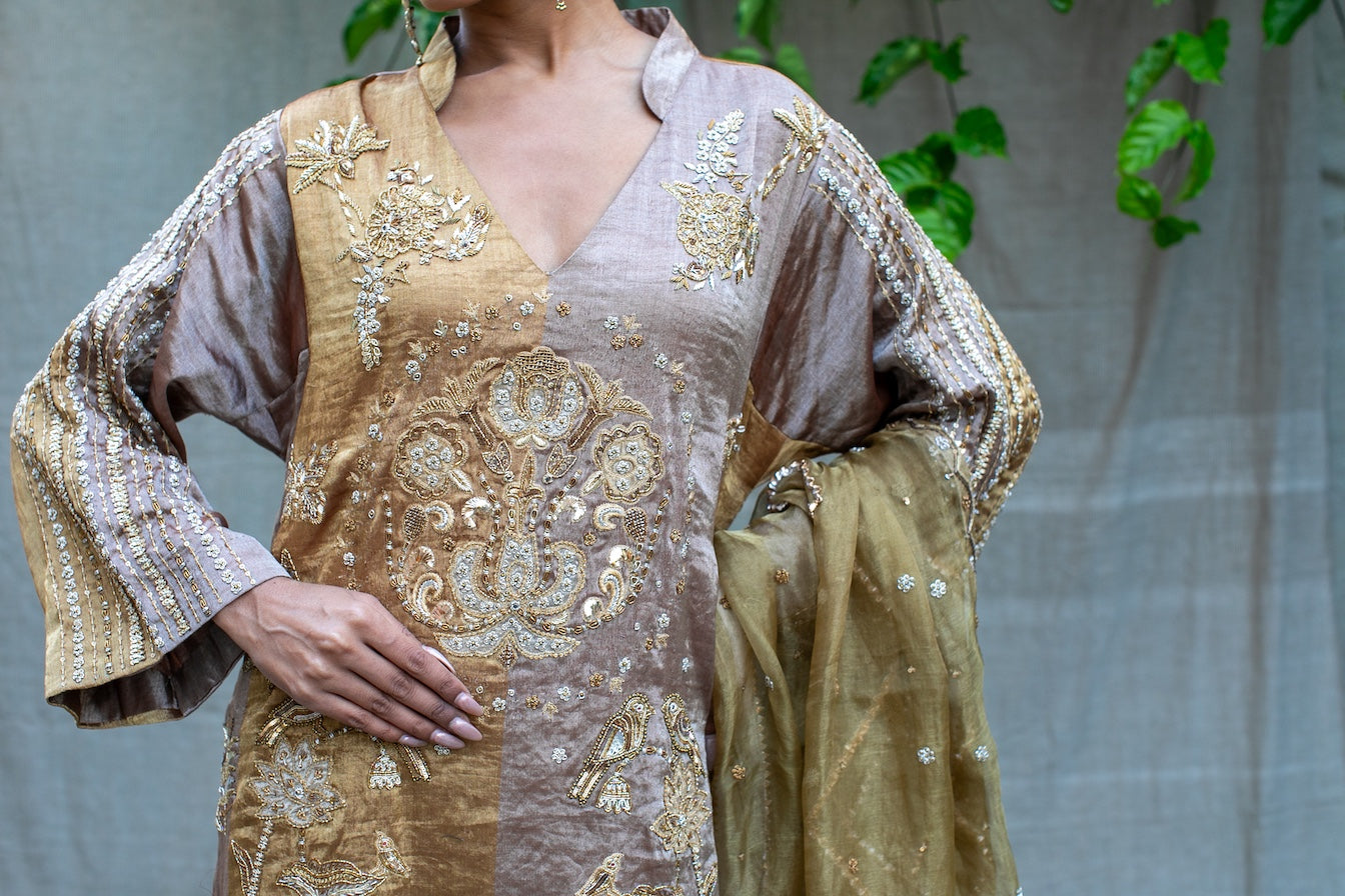 • Pure silk tissue gold and silver shirt, with zardozi hand embroidery