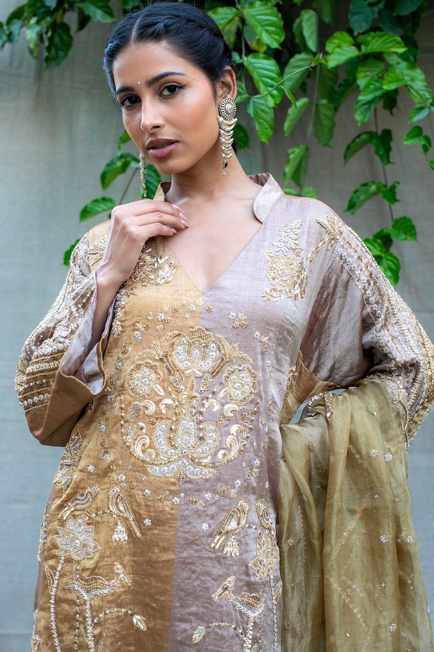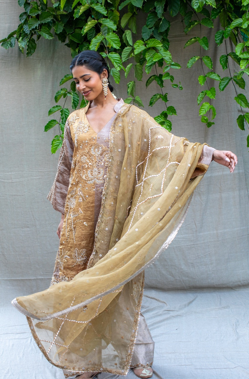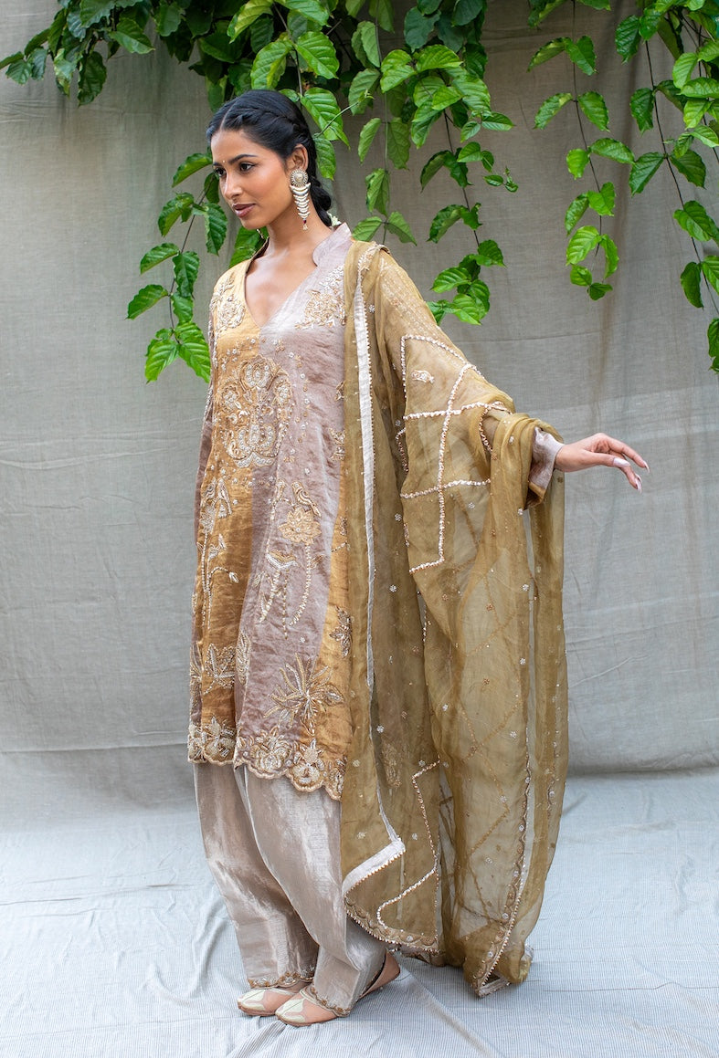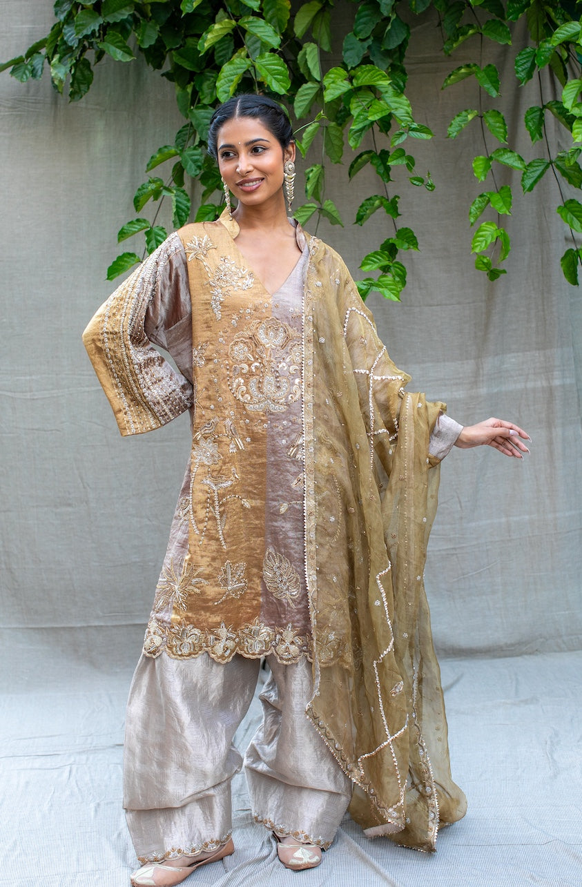 • Pure silk tissue gold and silver shirt, with zardozi hand embroidery