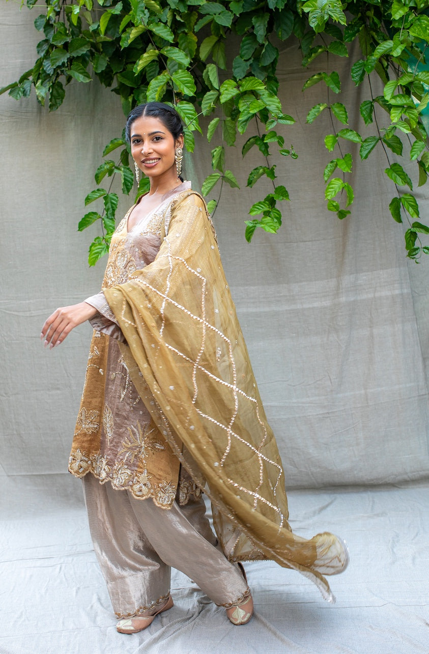 • Silver pure silk salwar with embroidery and gold dupatta with gota work and zardozi.