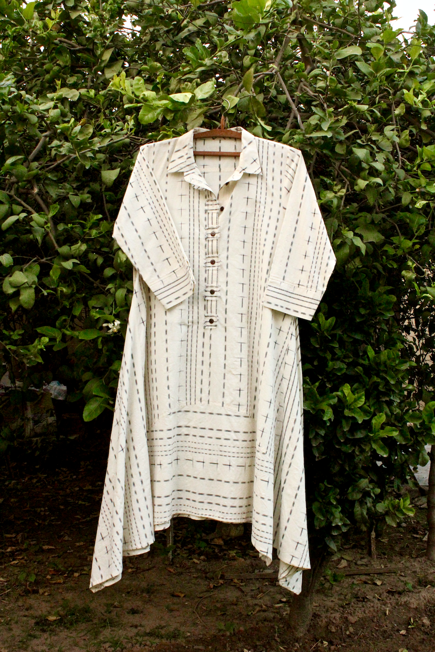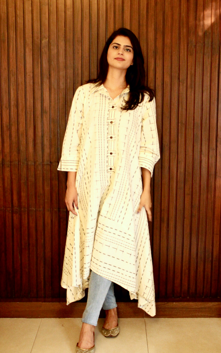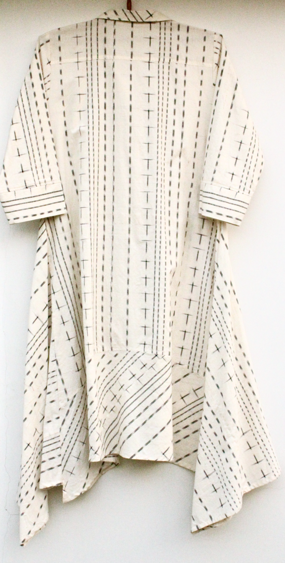Off-white and black ikat weave styled in an asymmetrical anti-fit cut giving it a feel of comfort and elegance. Pants not included.