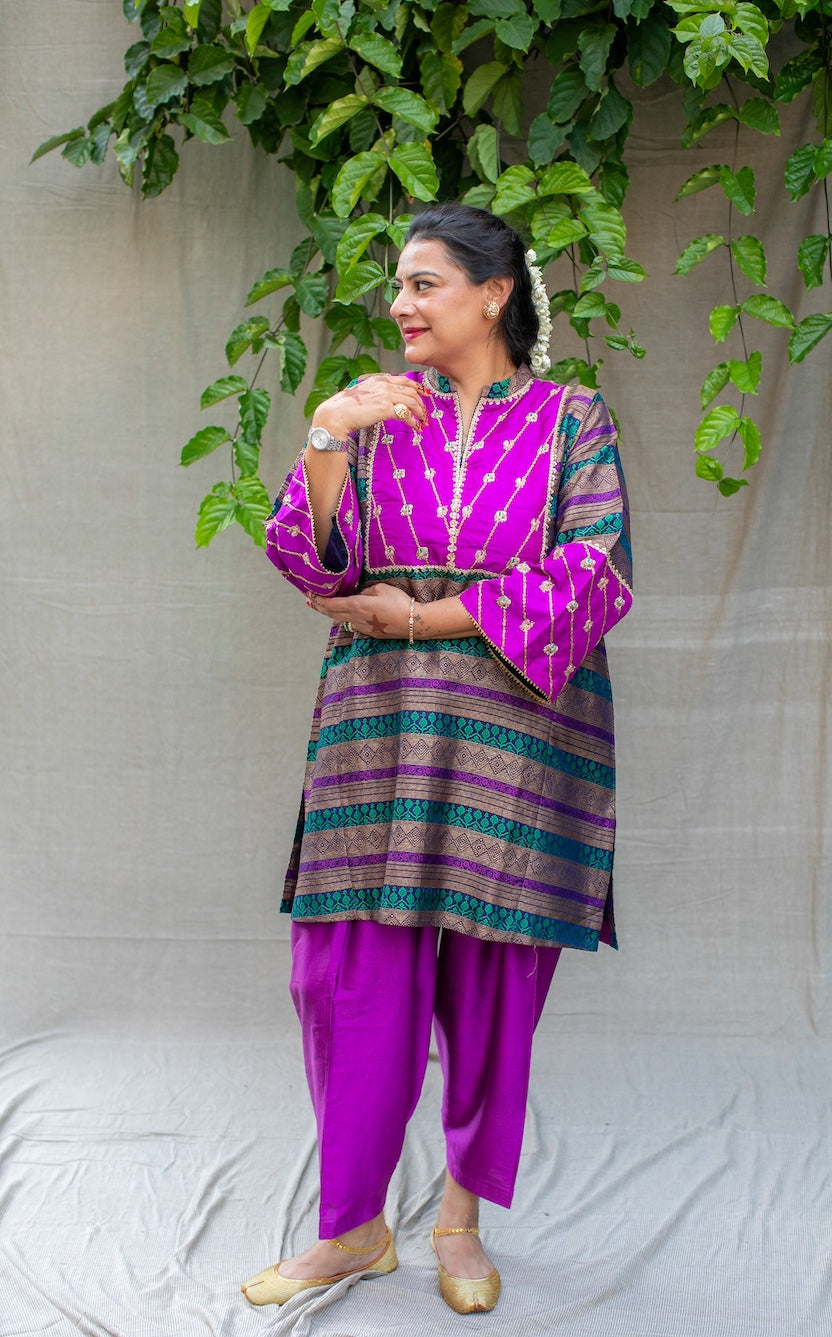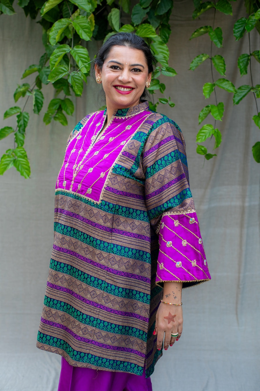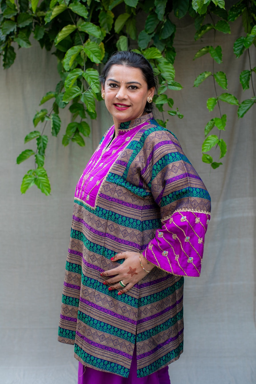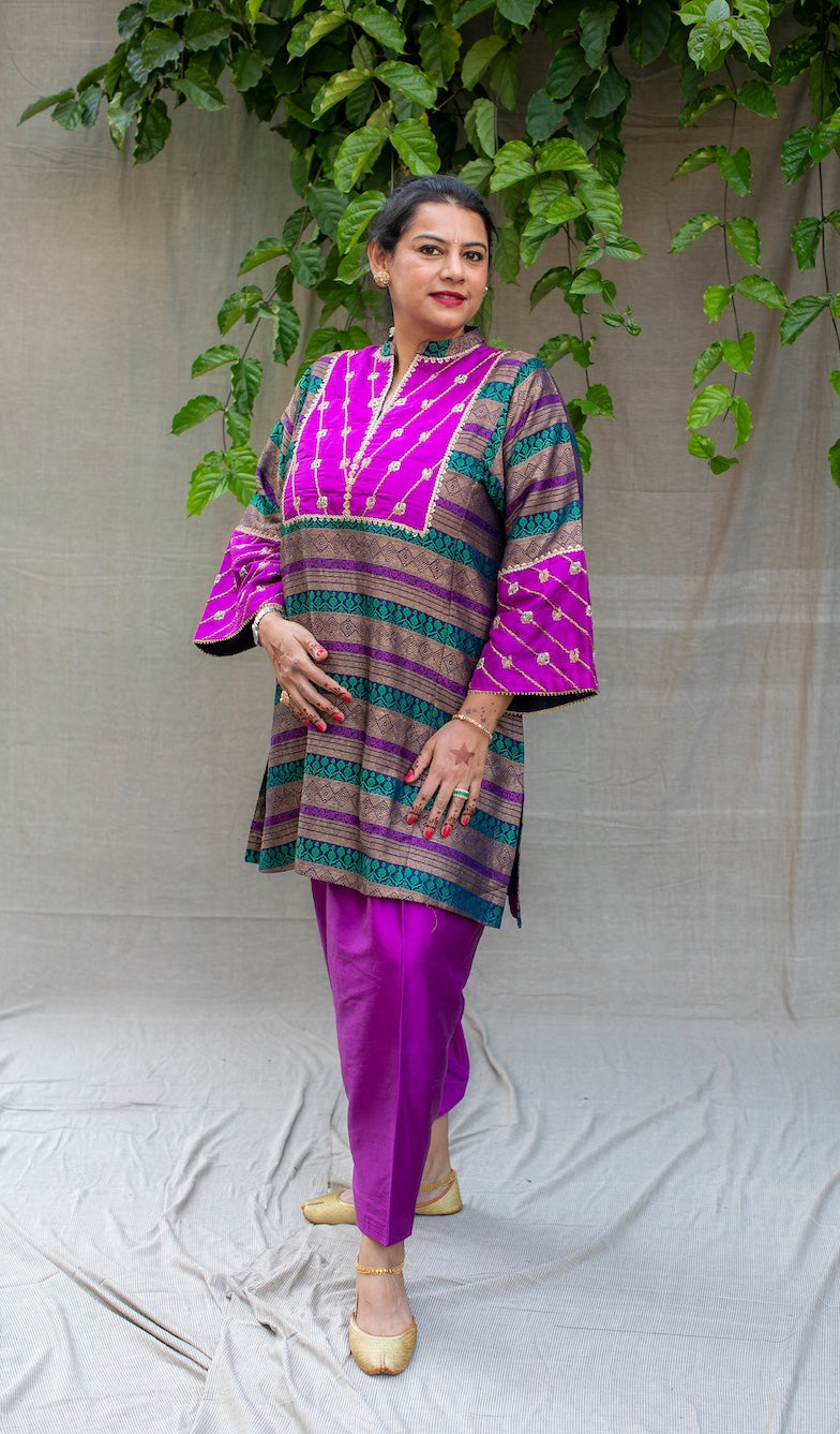 • Pure silk striped brocade with fine detailed embroidery on the yoke and sleeves.