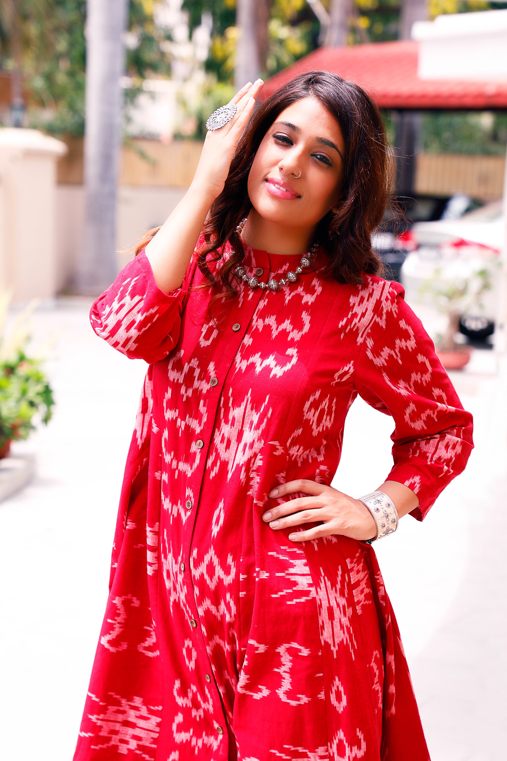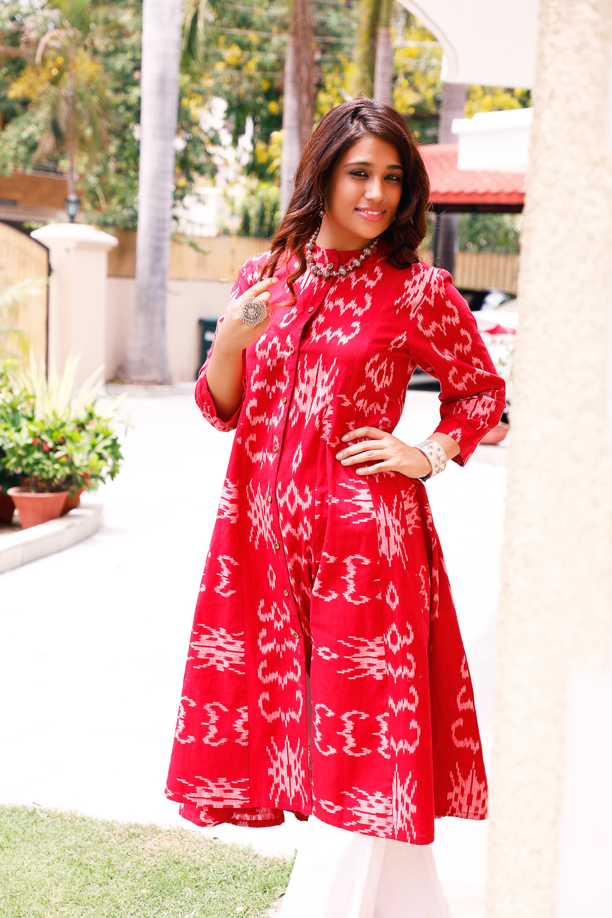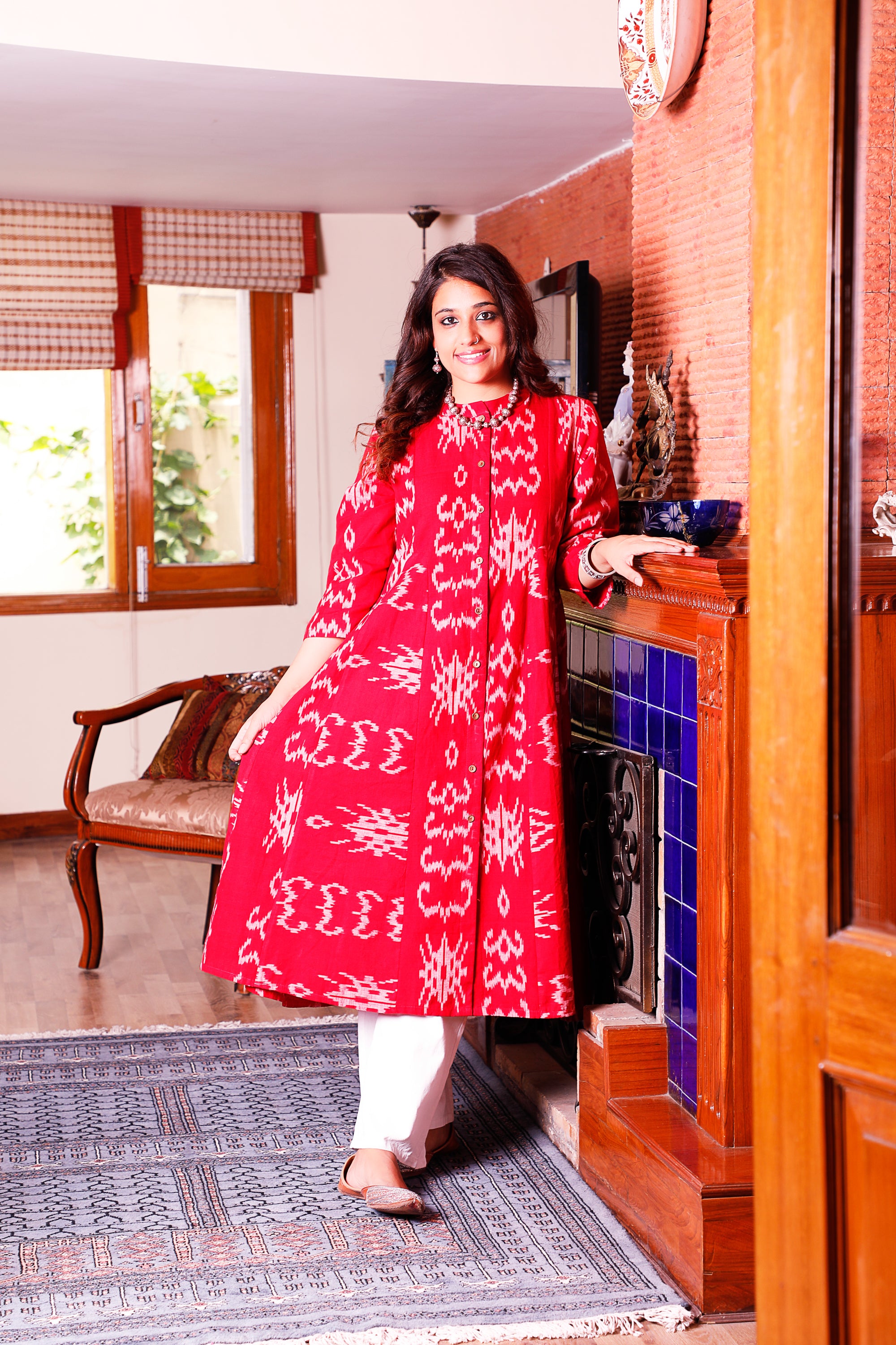 Brighten up your day with this vibrant red and white kurta. An ethnic fabric with a trendy cut giving it a contemporary look. Pants are not included.
