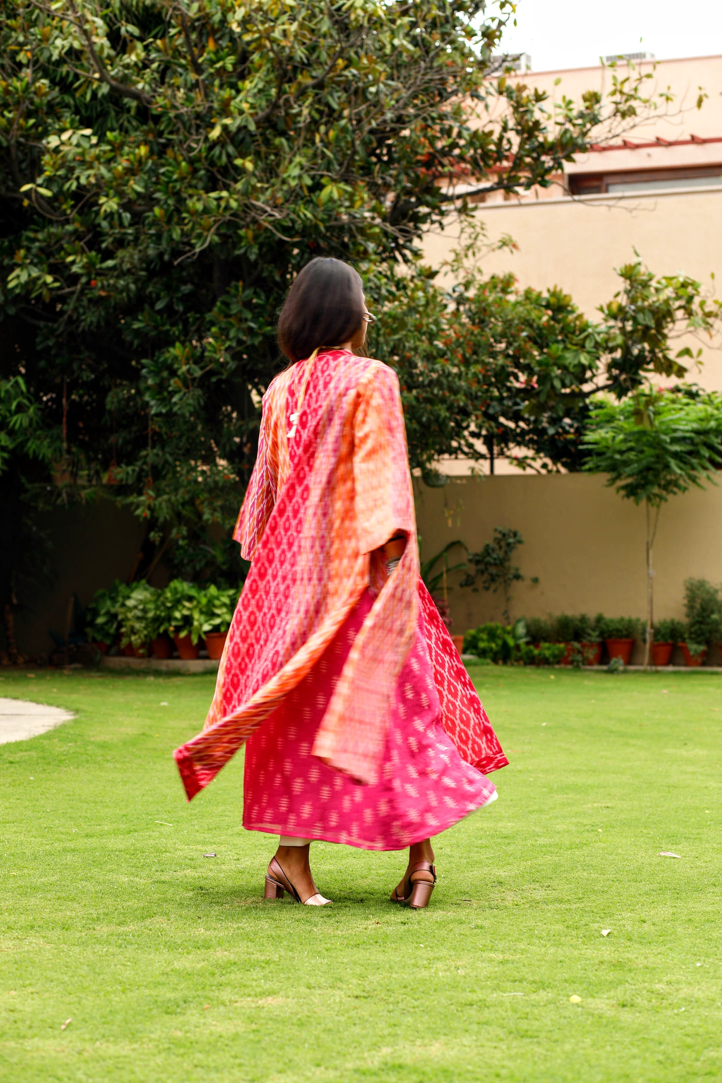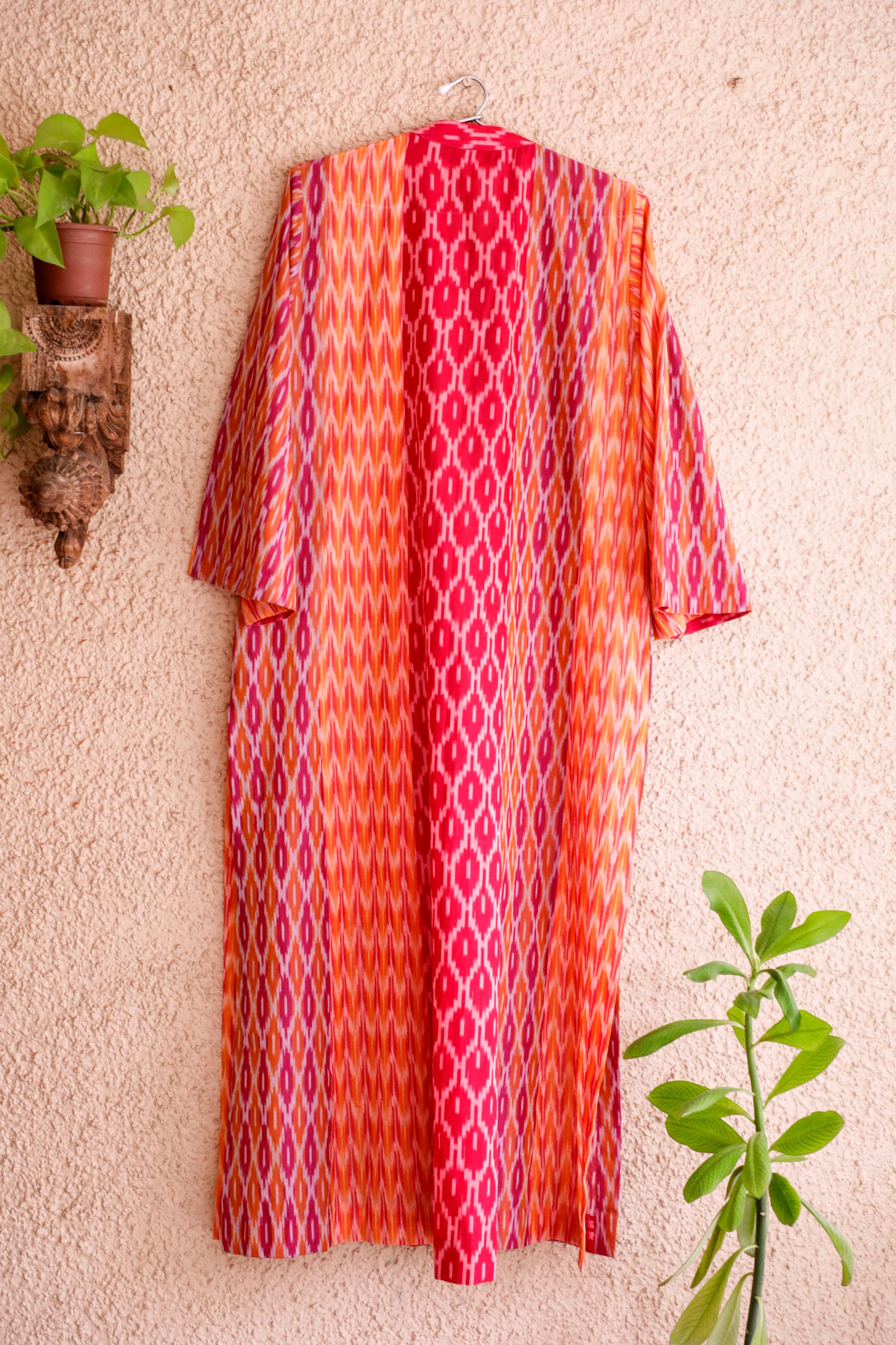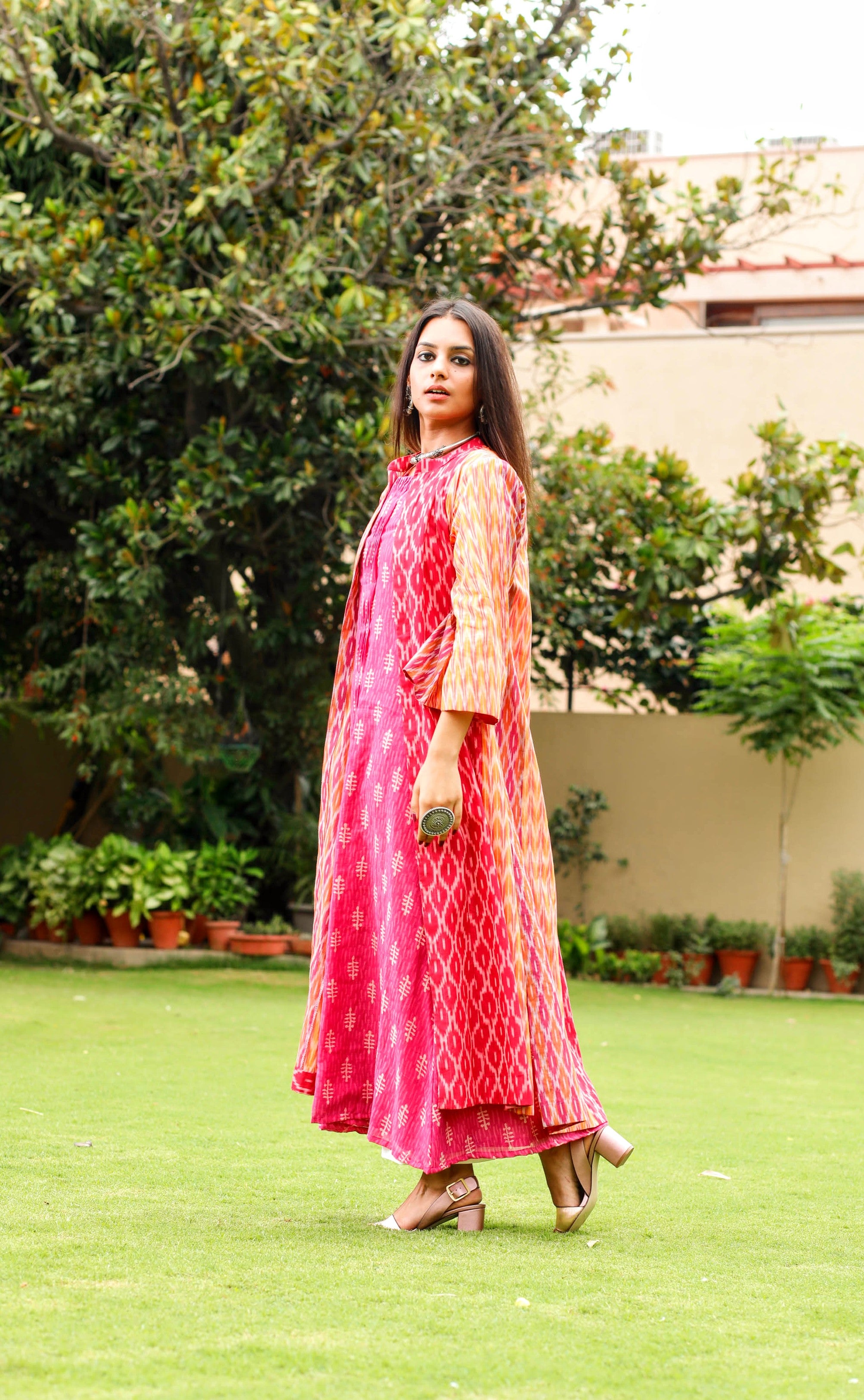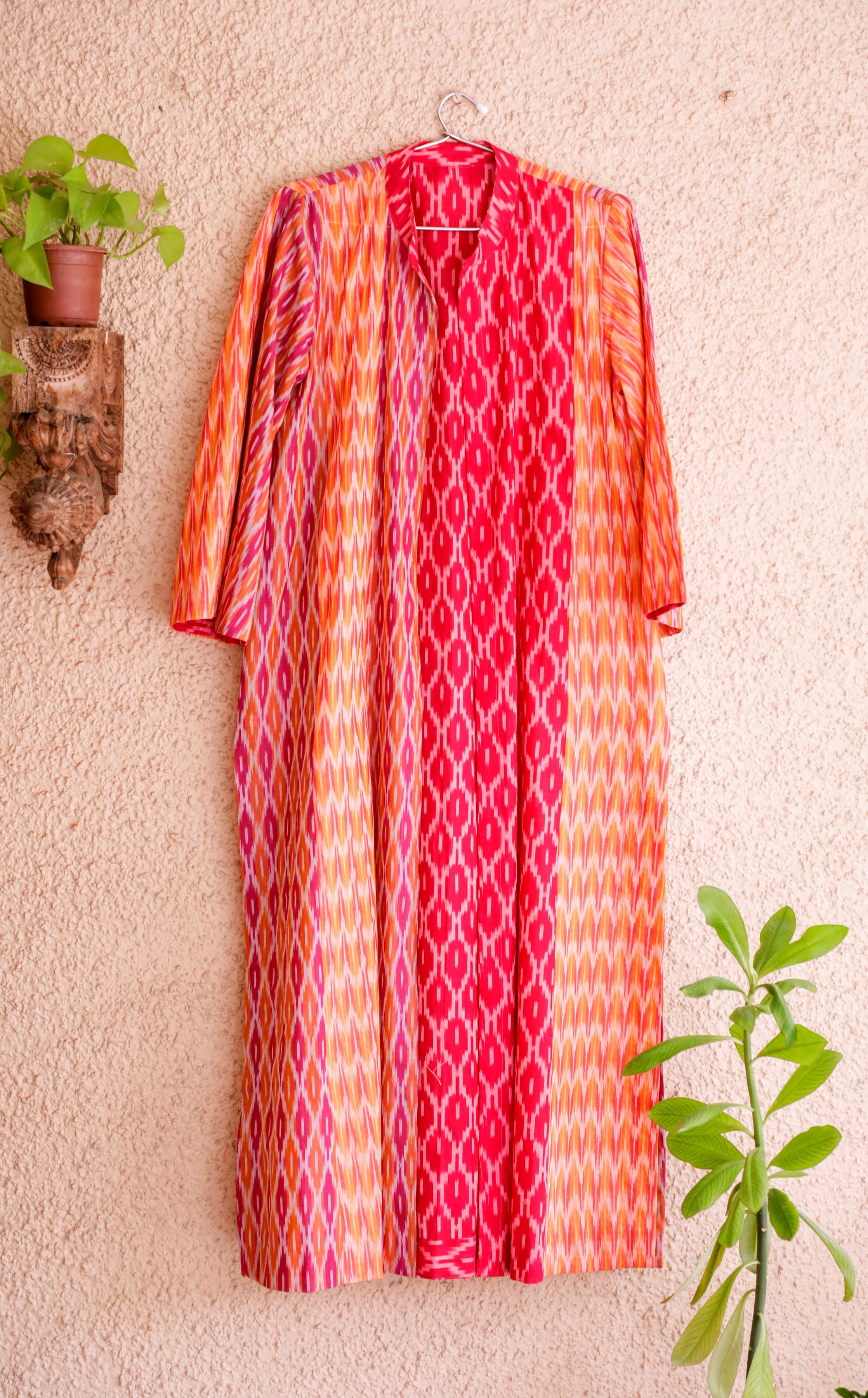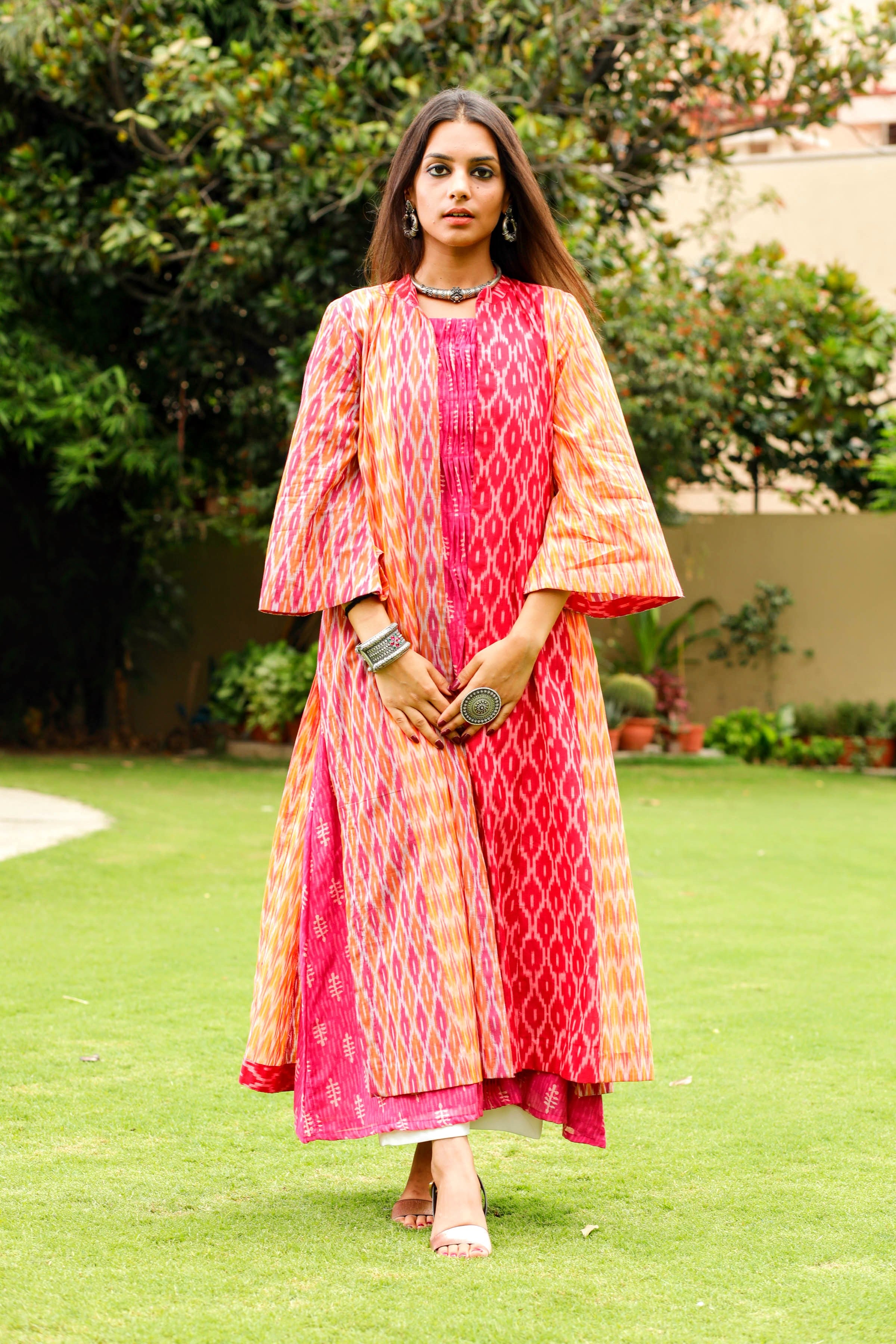 Aesthetically used 3 different shades of Ikat for this anti-fit overlay. This can be worn with different inners adding color and cheer to the look.