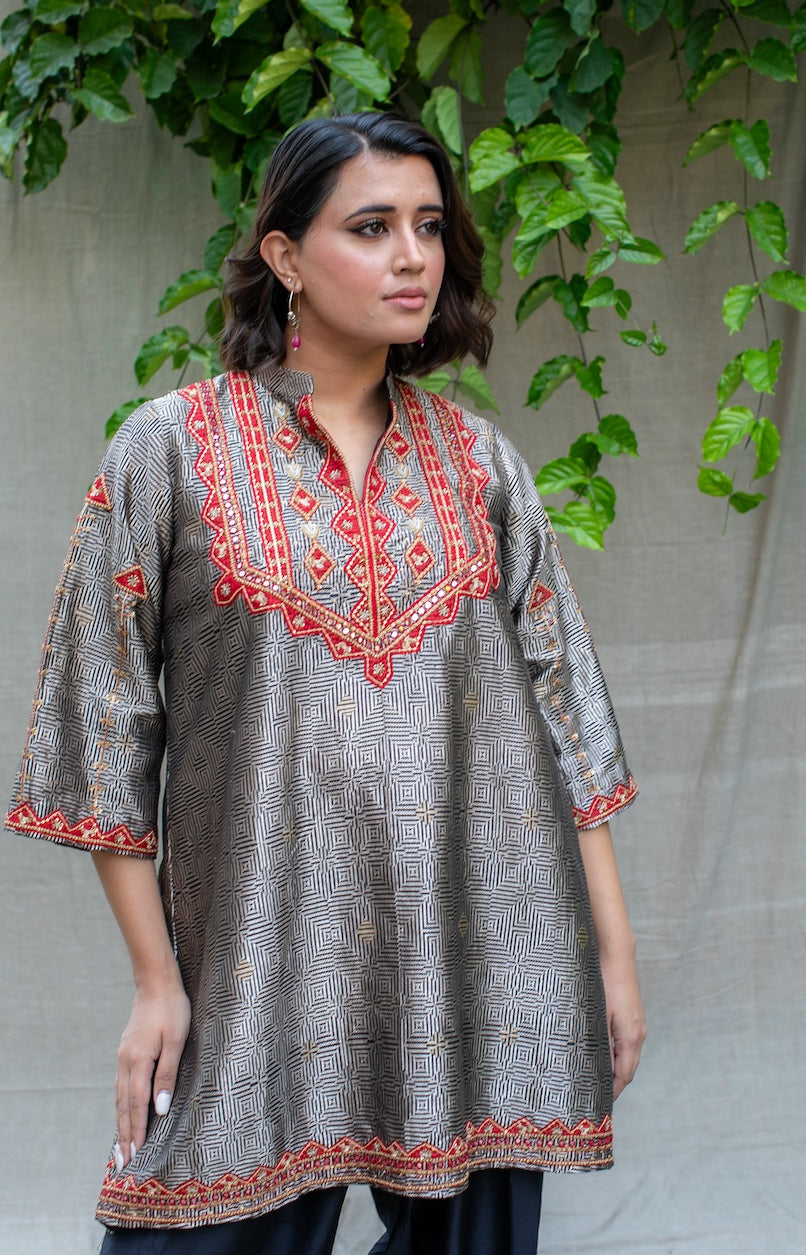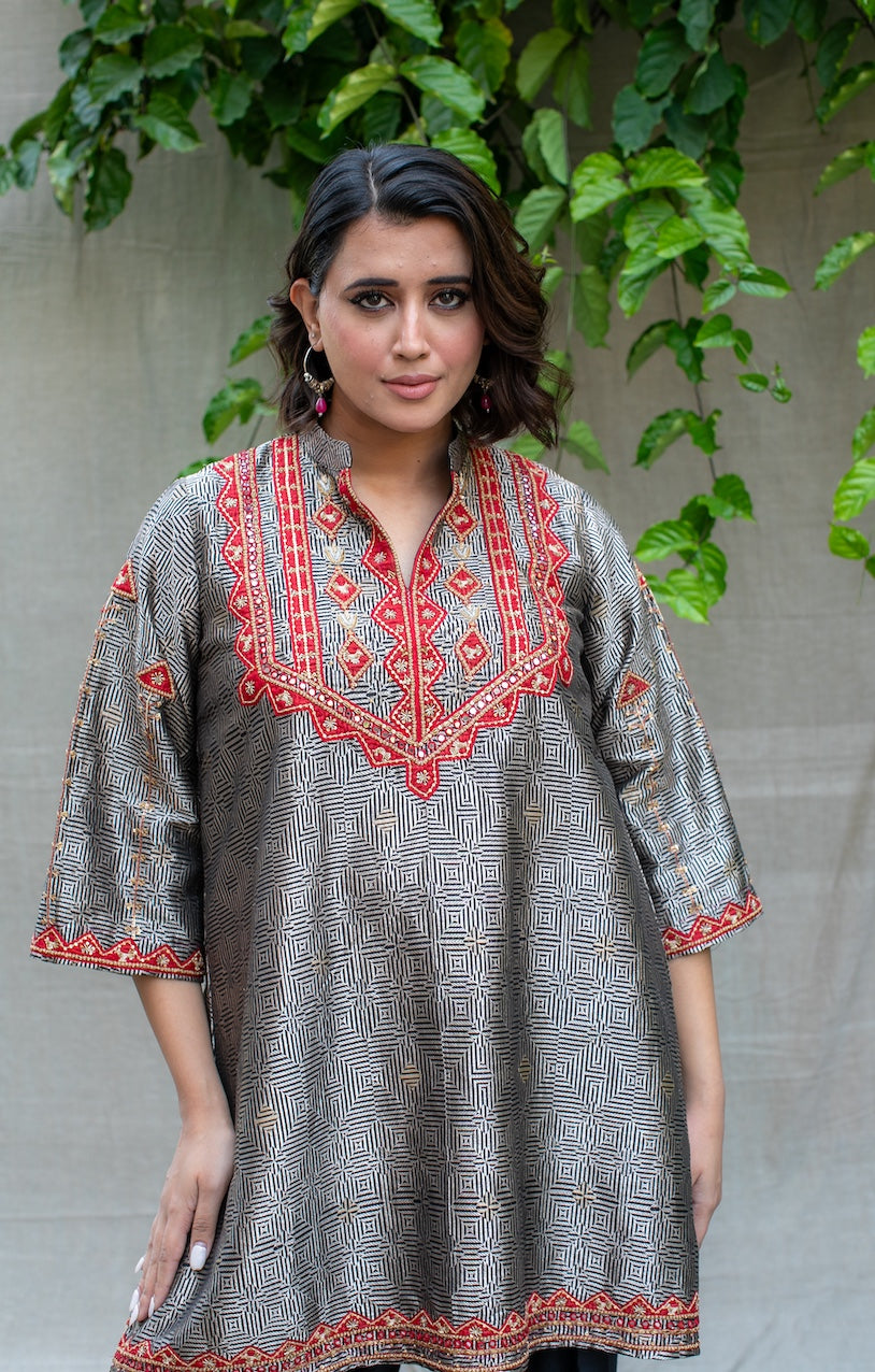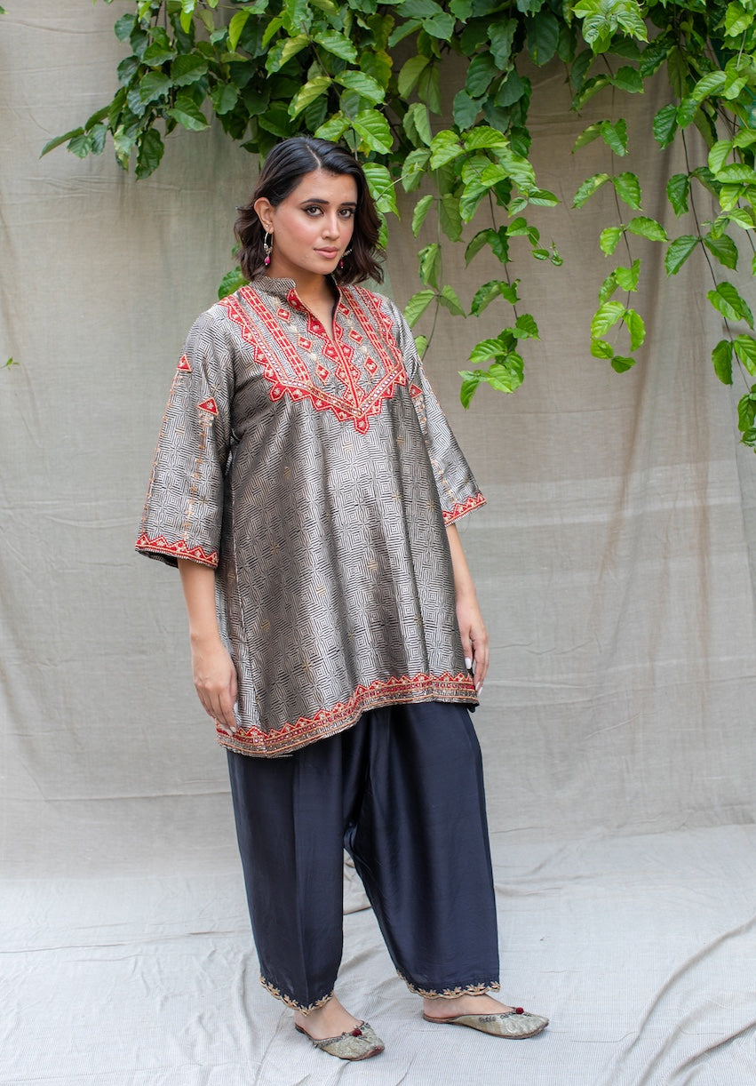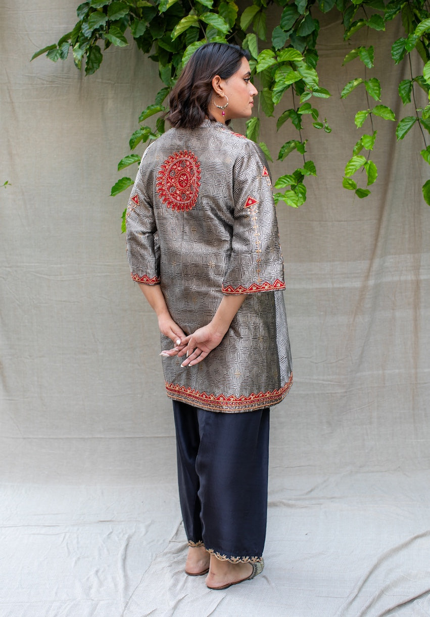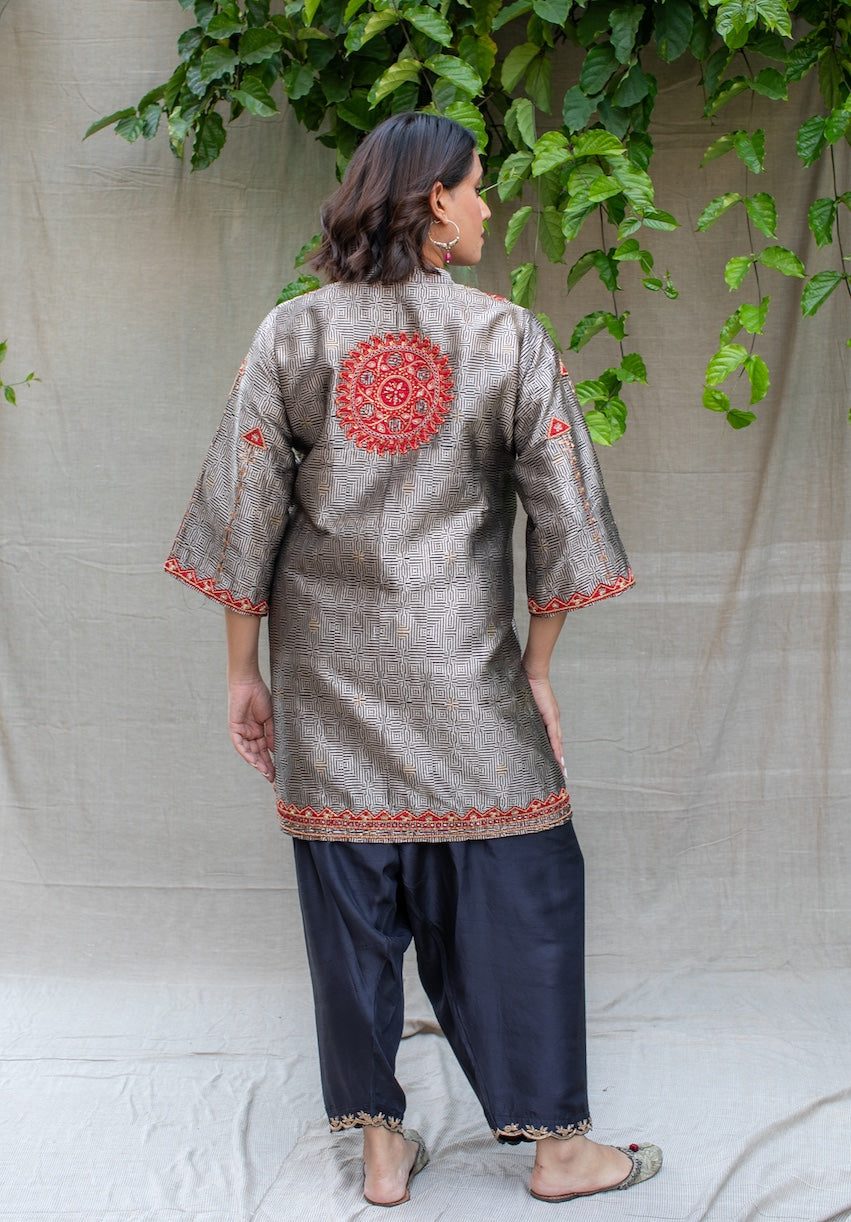 • Pure silk brocade shirt with red and gold zardozi embroidery.