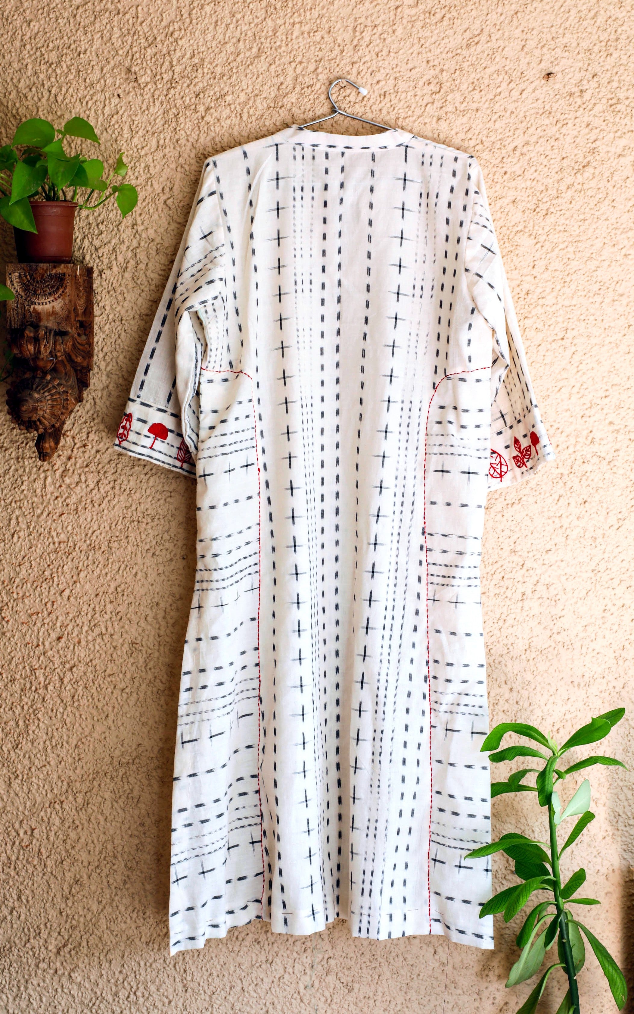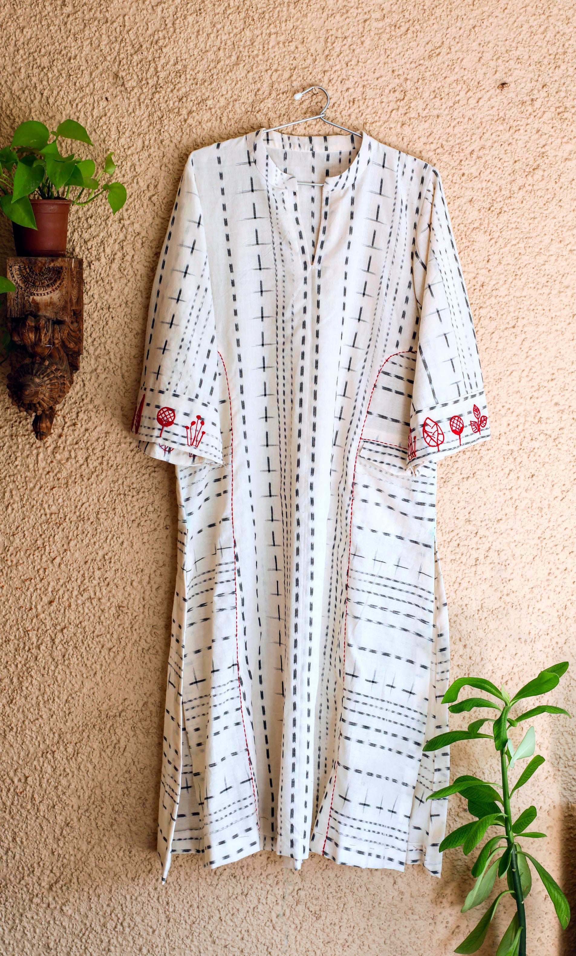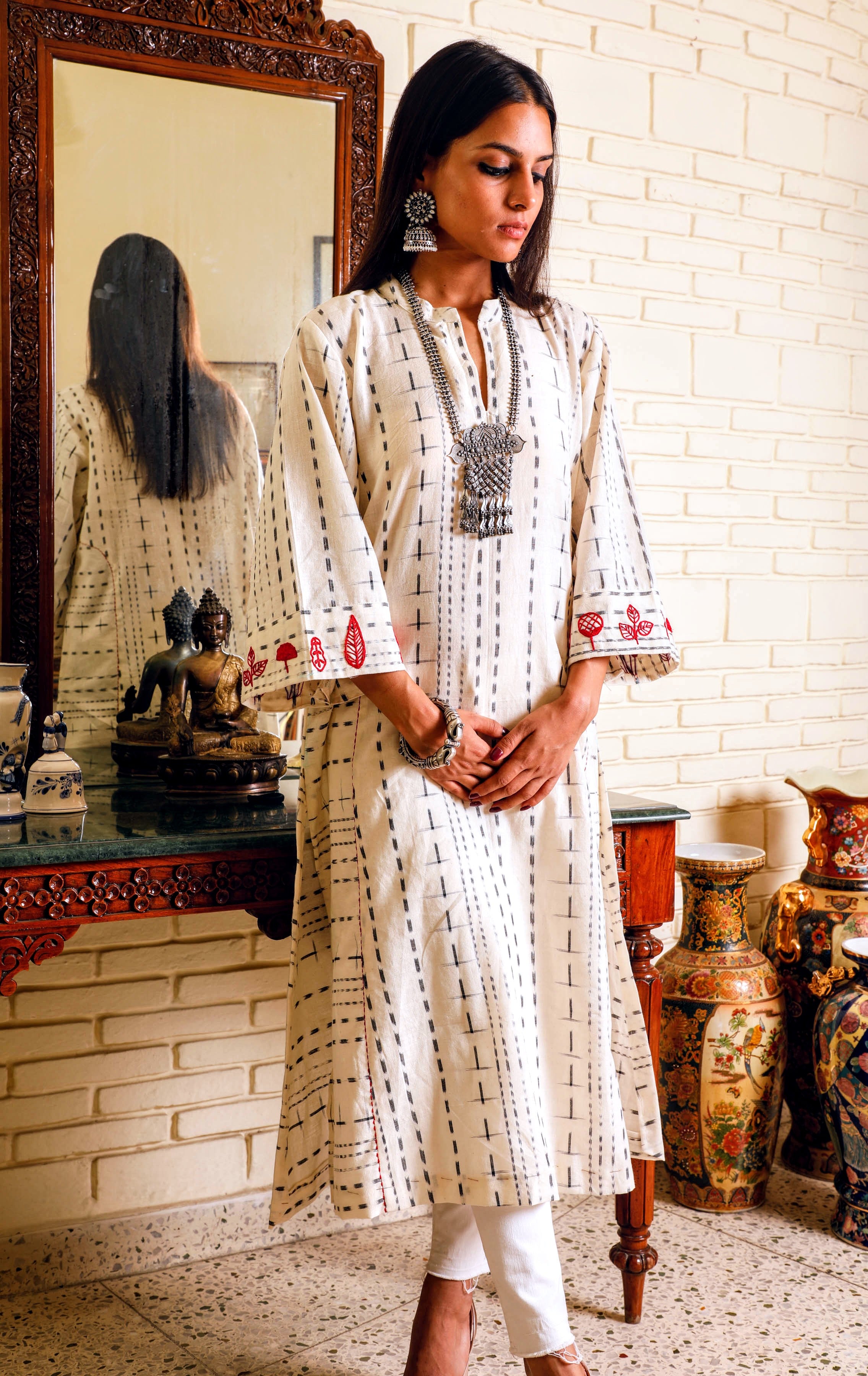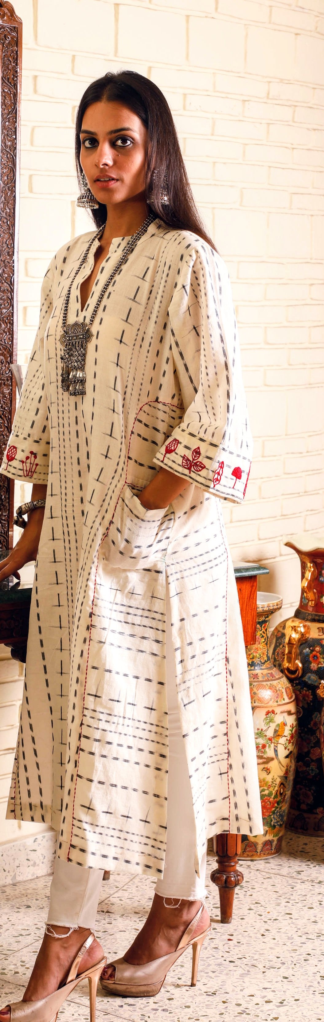 Off white and black Ikat kurta with red embroidery on the sleeves. A multi-occasion kurta which can be dressed up with accessories or worn casually. Pants are not included.