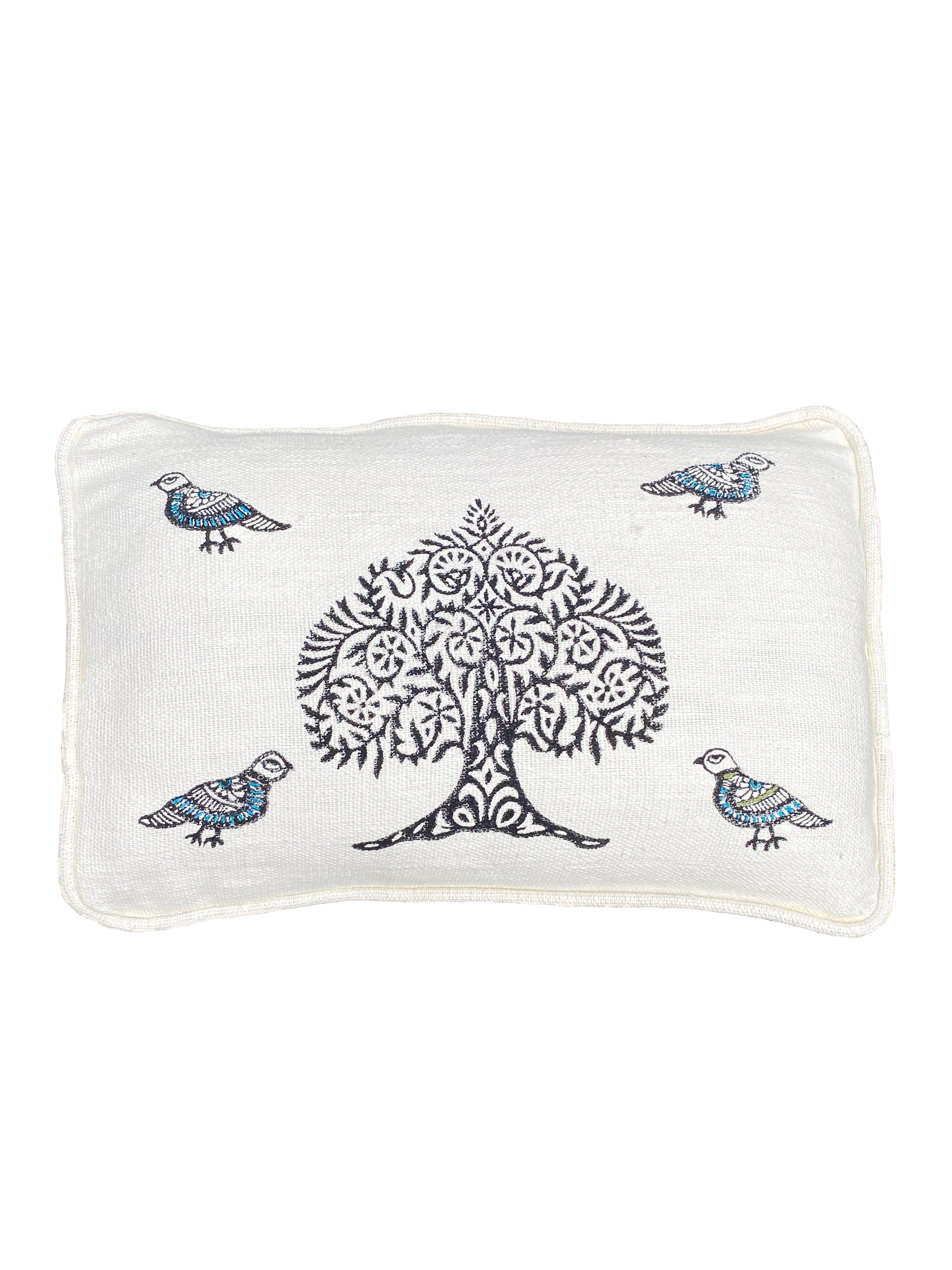 This off white cushion cover comes with an artistic tree and bird pattern hand block printed on it's front. The print is highlighted with turquoise embroidery adding colour and detail to it.